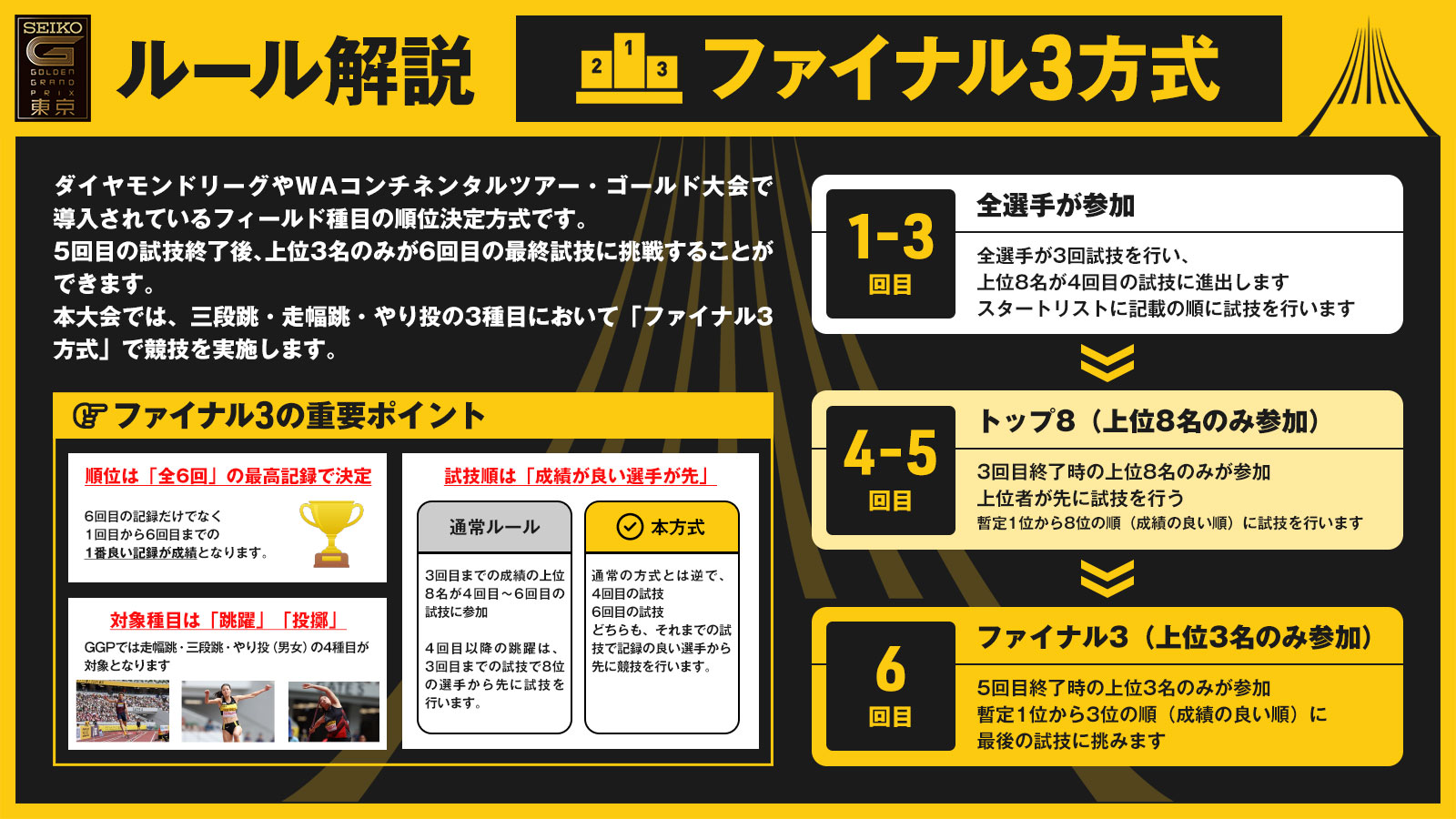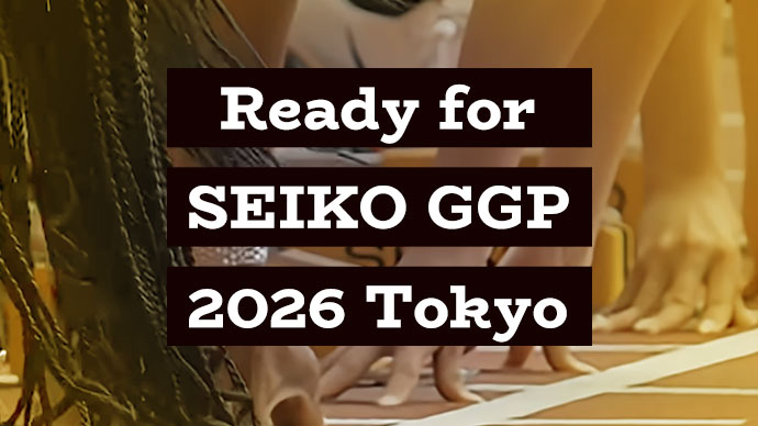 GUIDE楽しむガイド Ready for SEIKO GGP 2026 Tokyo出場選手の意気込みを映像で グッズ販売について完売必至!ご購入はお早めに ファイナル3方式とは?本大会の三段跳・走幅跳・やり投において「ファイナル3方式」で競技を実施します 出張輪島朝市出店今年も能登半島復興支援へのご協力をお願いいたします。 GW5/6(水)は赤坂サカスへ!体験イベントやプレゼント企画も!~事前申込受付中~