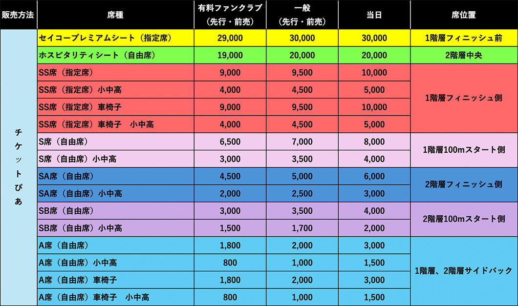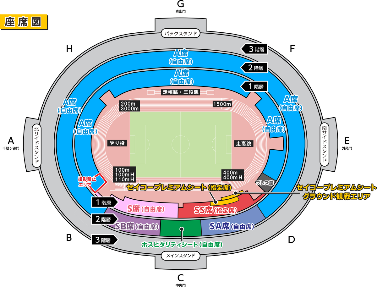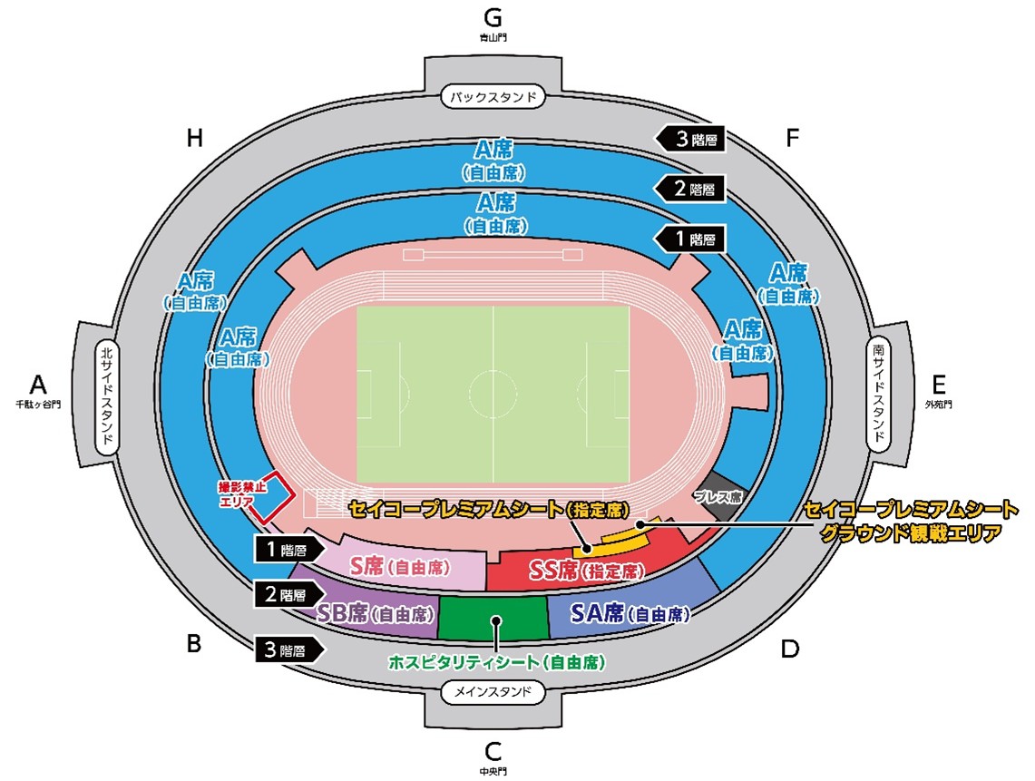 ※セイコープレミアムシート、ホスピタリティシート、SS席、S席、SA席、SB席の購入でA席での観戦が可能です。