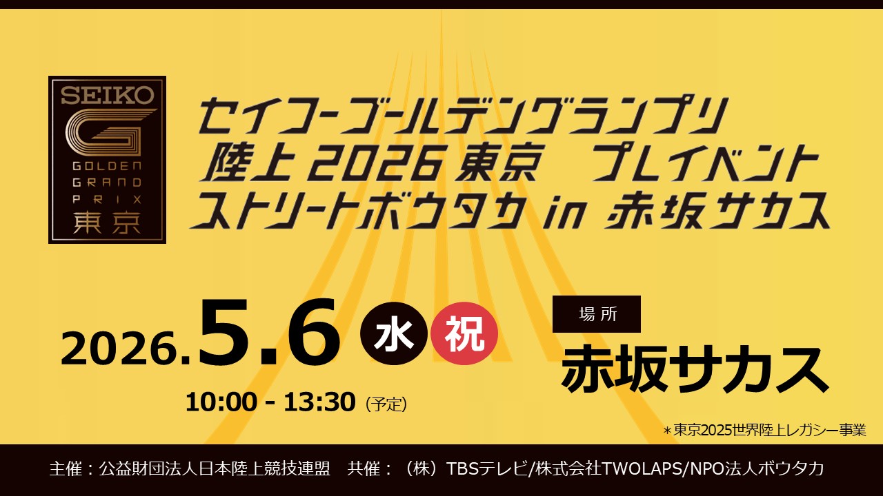 5月17日(日)、MUFGスタジアム(国立競技場)にて開催される、「セイコーゴールデングランプリ陸上2026東京」のプレイベントとして「ストリートボウタカ in 赤坂サカス」の開催が決定いたしました!