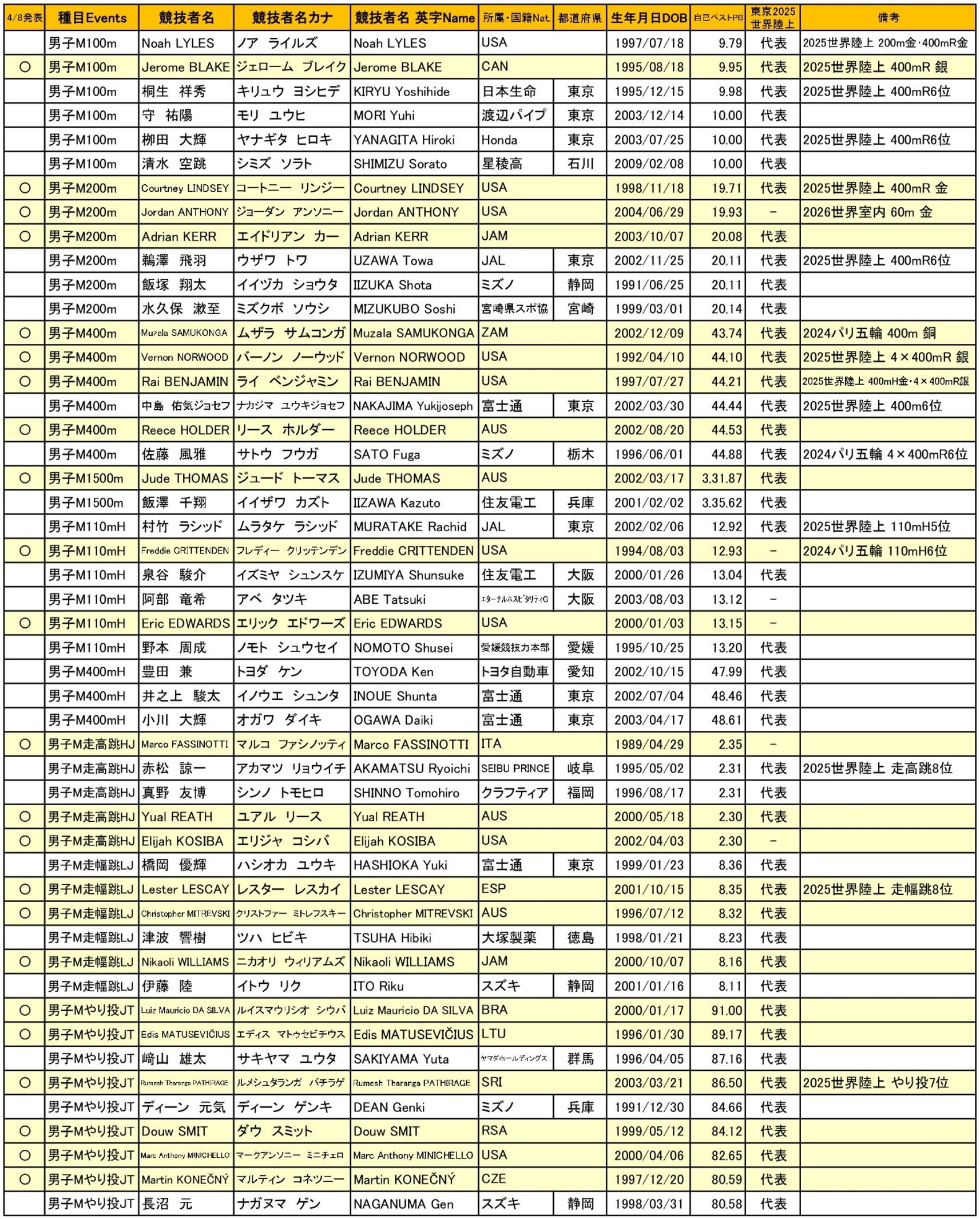 2026年5月17日(日)MUFGスタジアム(国立競技場)にて開催する「セイコーゴールデングランプリ陸上2026東京(以下、セイコーGGP)」の出場選手情報の第4弾をお知らせします。2025年9月に開催された「東京2025世界陸上」は世界中の注目を集め、延べ約62万人が熱狂し、大きな感動と熱気を生み出しました。その東京2025世界陸上 男子400mHで優勝しパリ五輪から 2連覇中のライ・ベンジャミン(USA)選手がセイコーGGPで男子400mに出場が決定!同じく東京2025世界陸上 女子やり投で優勝したフレイシ・アングロ(ECU)選手の参戦も決定しました。男子200mには4×100mリレーで優勝しているコートニー・リンジー(USA)選手もエントリーしています。東京世界陸上の熱を冷ますことなく、ノア ライルズ(USA)選手を含む4名の金メダリストたちが国立の舞台に戻ってきます!!!