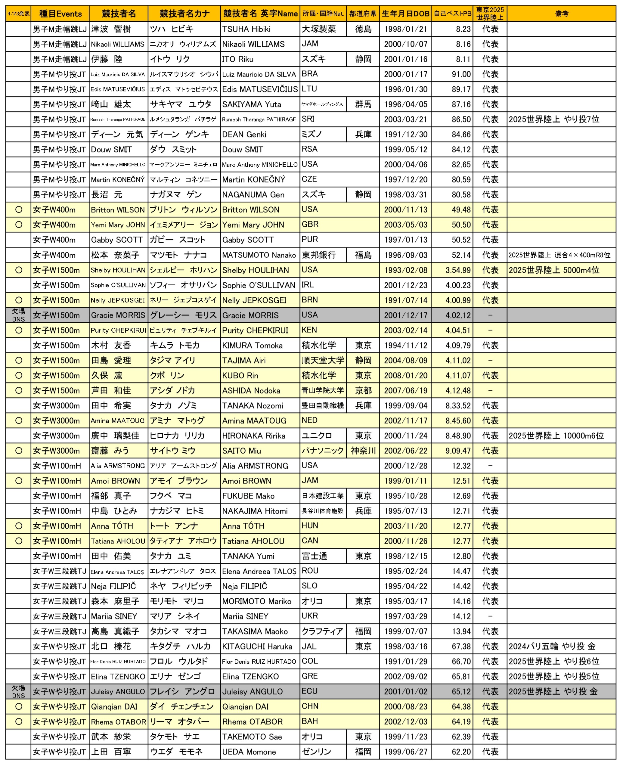 また、出場を予定しておりました男子110mH・村竹ラシッド(JAL)選手、男子走高跳・赤松諒一(SEIBU PRINCE)選手、女子1500m・グレーシーモリス(USA)選手、女子やり投・フレイシアングロ(ECU)選手が欠場することになりましたので、お知らせいたします。