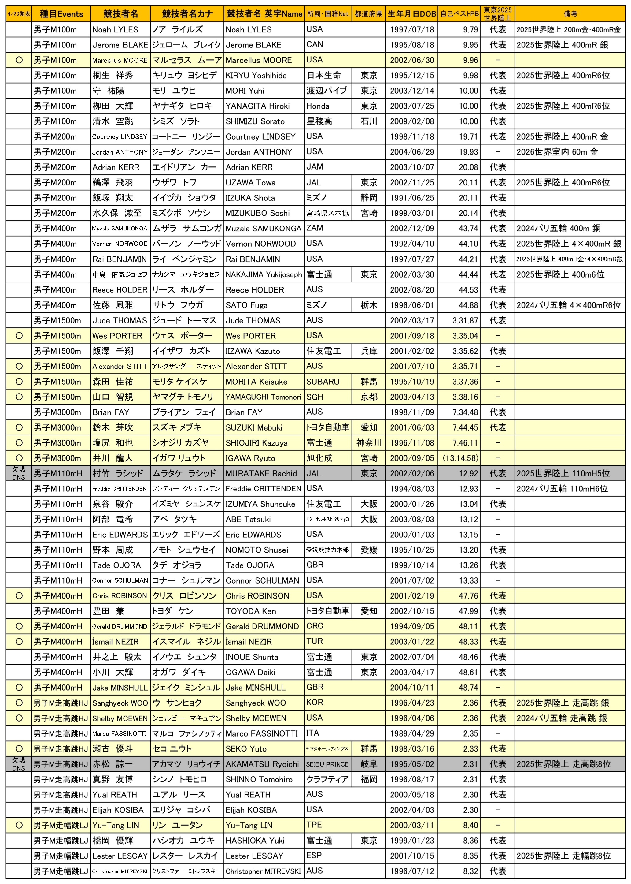 | 男子110mH | 村竹 ラシッド | MURATAKE Rachid | JAL・JPN | ダイヤモンドリーグ(DL)ドーハ大会延期により、DL上海大会出場のため |