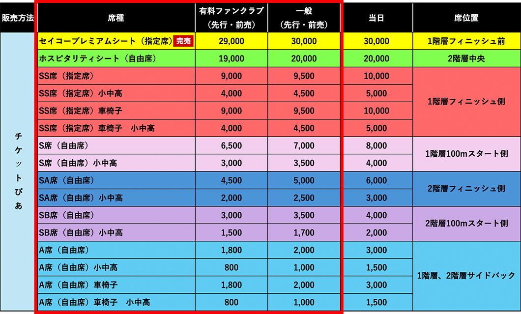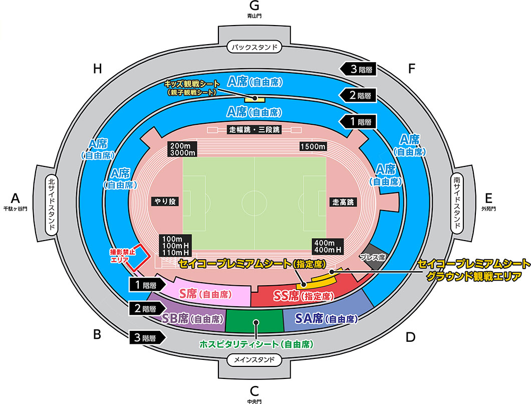 - セイコープレミアムシート、ホスピタリティシート、SS席、S席、SA席、SB席の購入でA席での観戦が可能です。